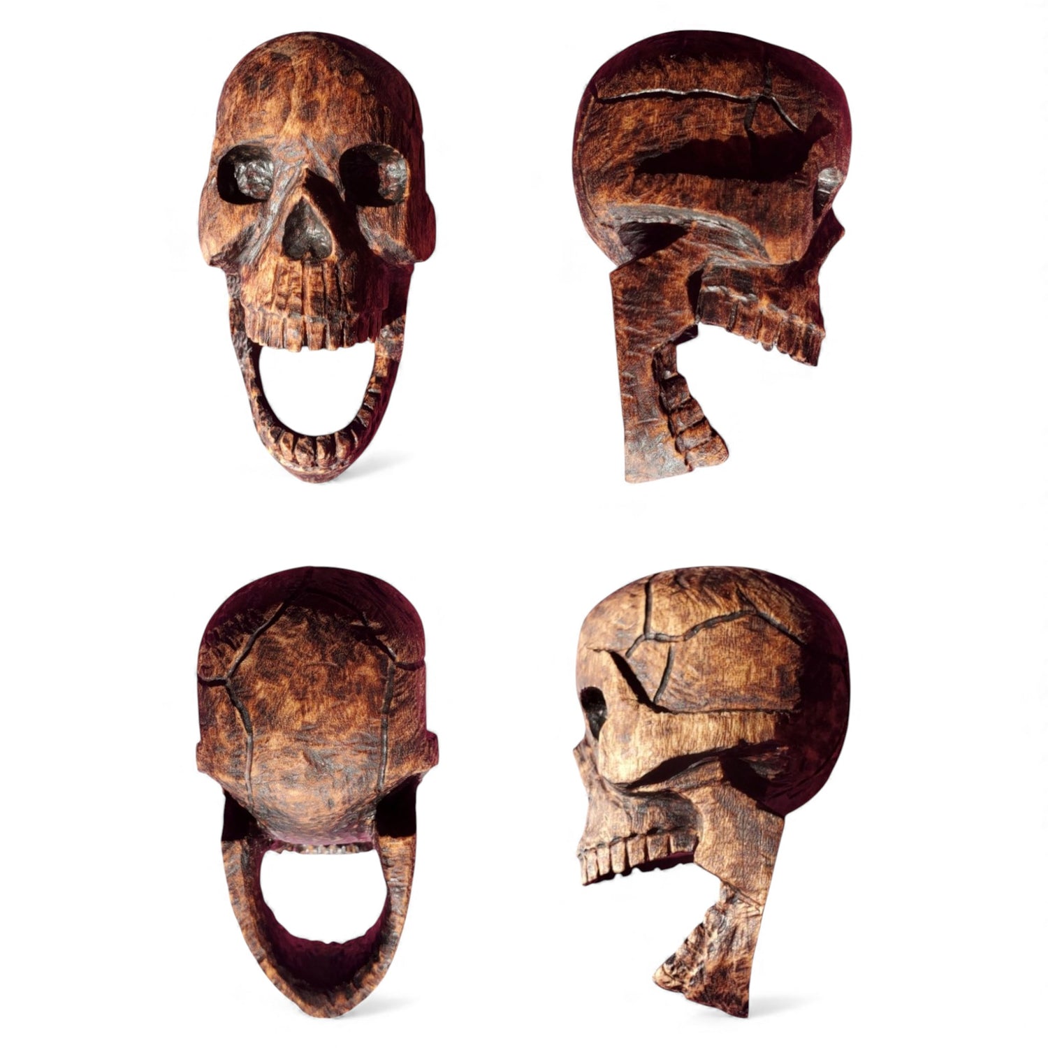 This hand-carved skull, lovingly whittled from a single piece of basswood and treated with a fiery finish for that extra spook-tacular flair, has temporarily taken a ghostly hiatus. But fear not, dear seeker of the supernatural! If you’d like to see this charming cranium re-emerge from the shadows, just give us a shout. We’ll gladly conjure it back from the great beyond!