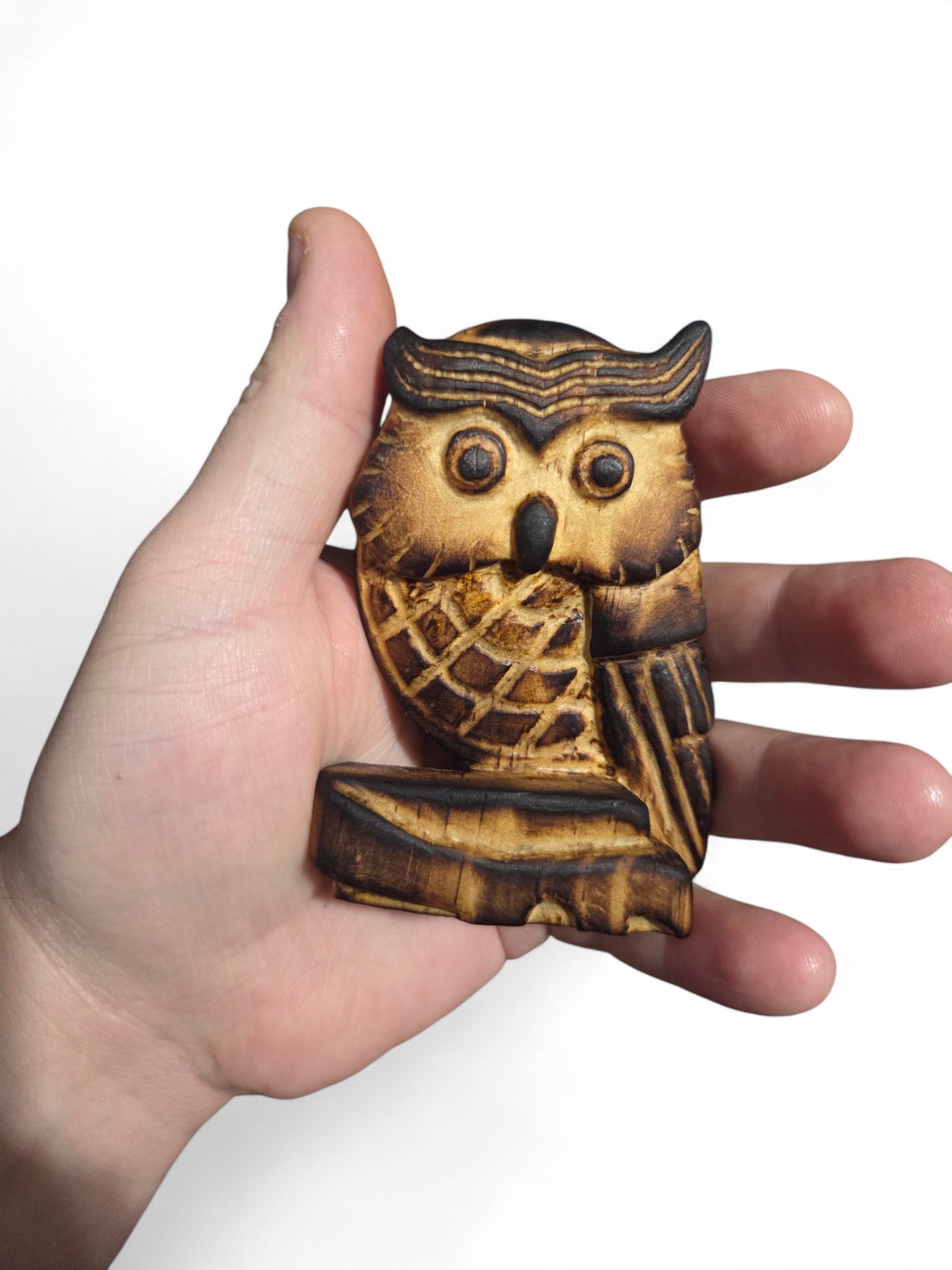 This hand-carved pinewood owl stands 3 5/8 inches tall, 2 5/8 inches wide, and 3/4 inch thick. Expertly crafted from pinewood, it features unique burned details that enhance its natural texture and character. Its compact size makes it an ideal decorative piece for shelves, desks, or display cases, adding a touch of artisanal charm to any space.