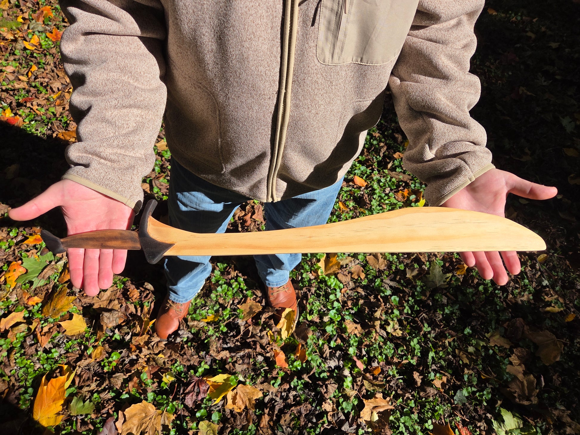 Unleash your inner warrior with this handcrafted pinewood sword! Measuring a mighty 27 3/4" from tip to pommel, this beauty features a 22 1/8" blade perfect for epic backyard battles and imaginative adventures. The charred handle adds rustic character while the 3 1/2" guard keeps your hand safe during combat. Whether you're a young knight-in-training or a seasoned adventurer, this 4 3/4" grip fits comfortably in hand. Built for play, crafted with care—your next legendary quest awaits!
